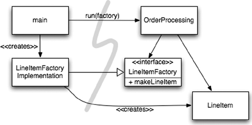 Again notice that all the dependencies point from main toward the OrderProcessing application. This means that the application is decoupled from the details of how to build a LineItem. That capability is held in the LineItemFactoryImplementation, which is on the main side of the line. And yet the application is in complete control of when the LineItem instances get built and can even provide application-specific constructor arguments.