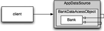 </beans>Each “bean” is like one part of a nested “Russian doll,” with a domain object for a Bank proxied (wrapped) by a data accessor object (DAO), which is itself proxied by a JDBC driver data source. (See Figure 11-3.)
