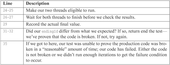 When we instrumented code with ConTest, our success rate went from roughly one failure in ten million iterations to roughly one failure in thirty iterations. Here are the loop values for several runs of the test after instrumentation: 13, 23, 0, 54, 16, 14, 6, 69, 107, 49, 2. So clearly the instrumented classes failed much earlier and with much greater reliability.