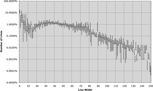 多数 Java 源代码文件有多大?事实说明,尺寸各各不同,长度殊异,如图 5-1 所示。
